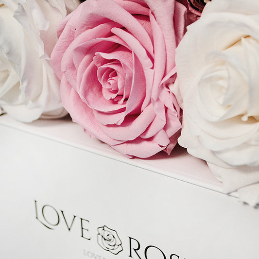 See how it works.5 Infinity Pink & White Roses in a White Box