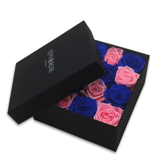 See how it works.Preserved Blue and Pink Roses in a Black Box