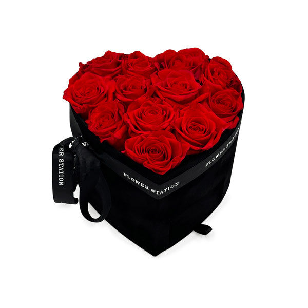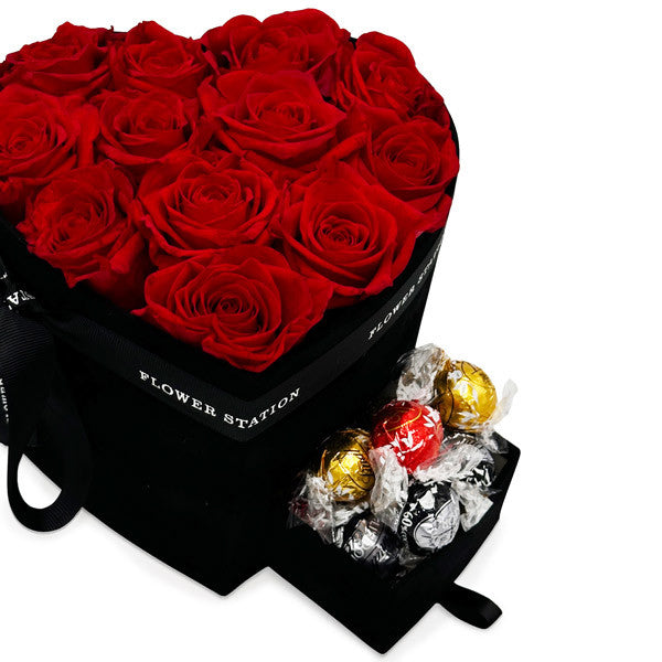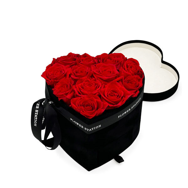 A collection of graceful infinity red rose heads, exquisitely arranged in a heart-shaped black velvet hat box, makes an ideal present for your significant other. Suitable for various special occasions such as birthdays or anniversaries, this gift allows you to express your boundless appreciation and affection. It also comes with a secret drawer containing surprise chocolates. Present genuine preserved roses that retain their natural appearance and delicate texture for over a year. (Approximate hatbox diameter: 16 cm)