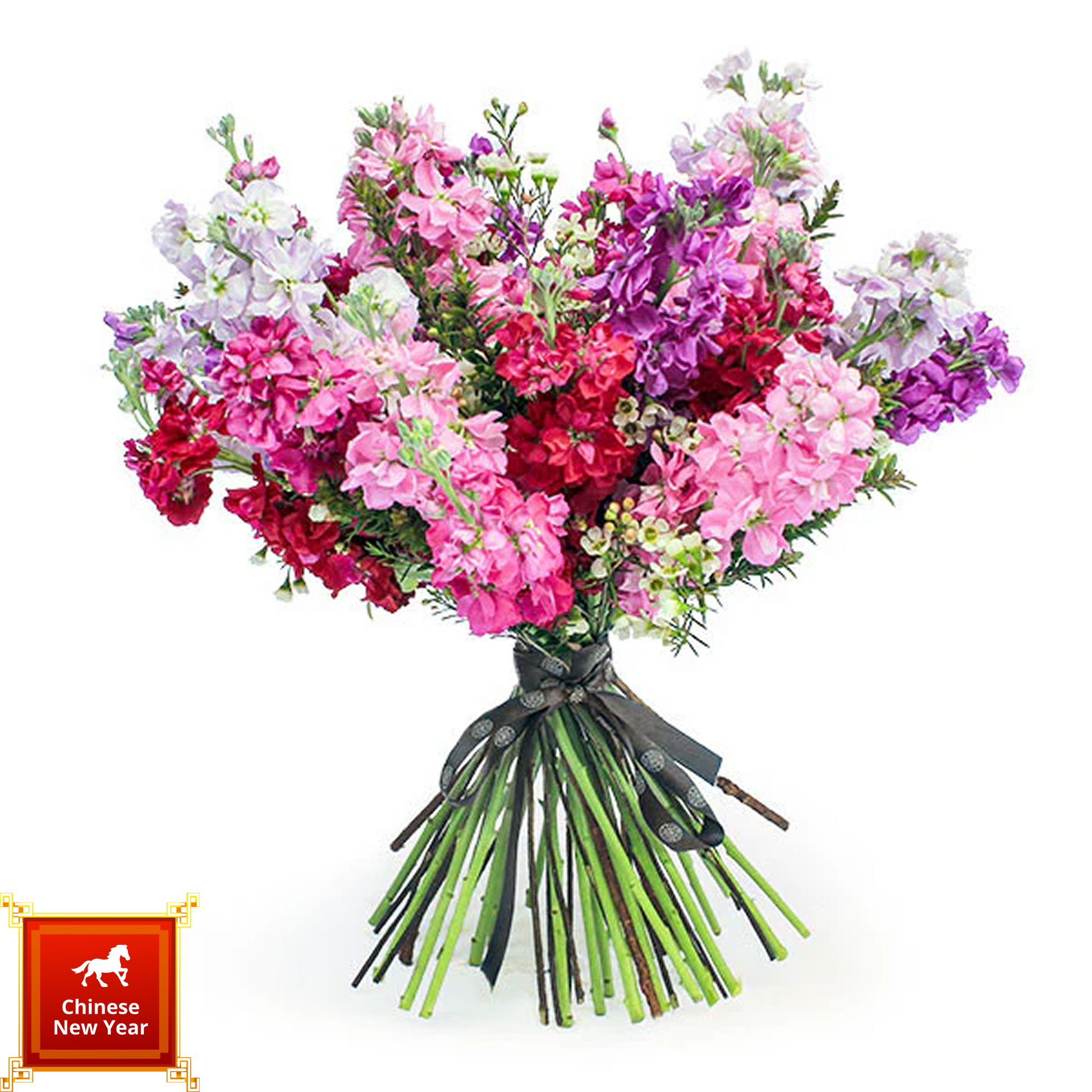 A fragrant mix of long-stemmed scented stocks in a colourful hand-tied bouquet. The perfect bunch of scented flowers that will look fantastic in a jug or vase at your home. A true winner! (Number of stocks stems per size: standard 15 /deluxe 25)